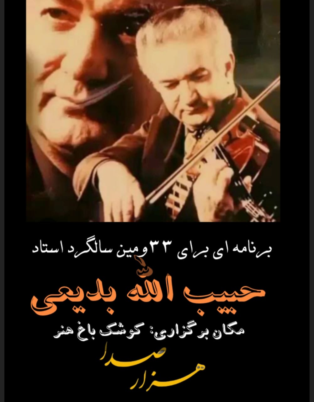 ویژه برنامه سالگرد درگذشت حبیب الله بدیعی یک شنبه ۲۷ مهرماه، ساعت ۱۸ با حضور خانواده ی استاد و تعدادی از هنرمندان برجسته ی موسیقی ایرانی در کوشک باغ هنر آغاز خواهد شد.